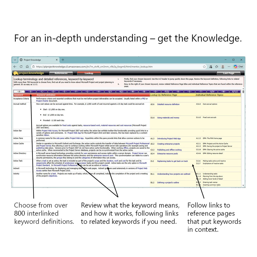 - With direct links to a comprehensive online Knowledge Base of everything Microsoft Project, you can be confident that your planning objectives can be realized as the smoke and mirrors of Project’s underlying structures and calculations are explained to you clearly and succinctly.